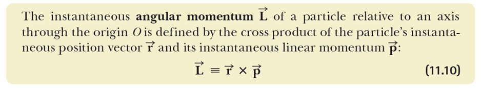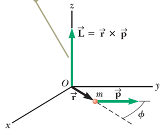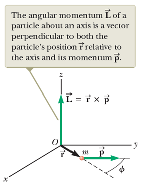 원점 O 를 관통하는 축에 대해 회전하는 입자의 각운동량 L 은 입자의 순간 위치 벡터 r 과 순간 선형 운동량 p 의 벡터곱으로 정의한다.